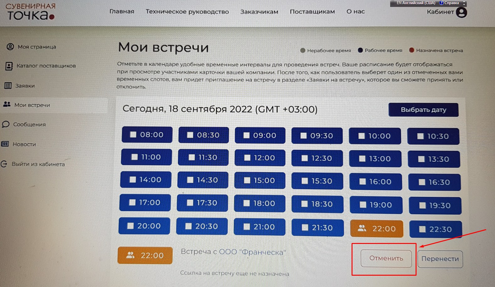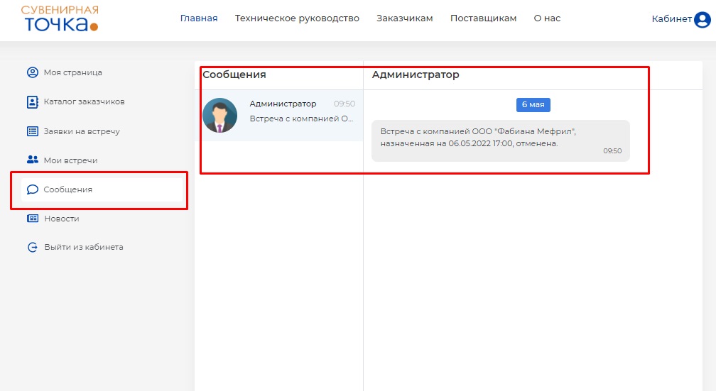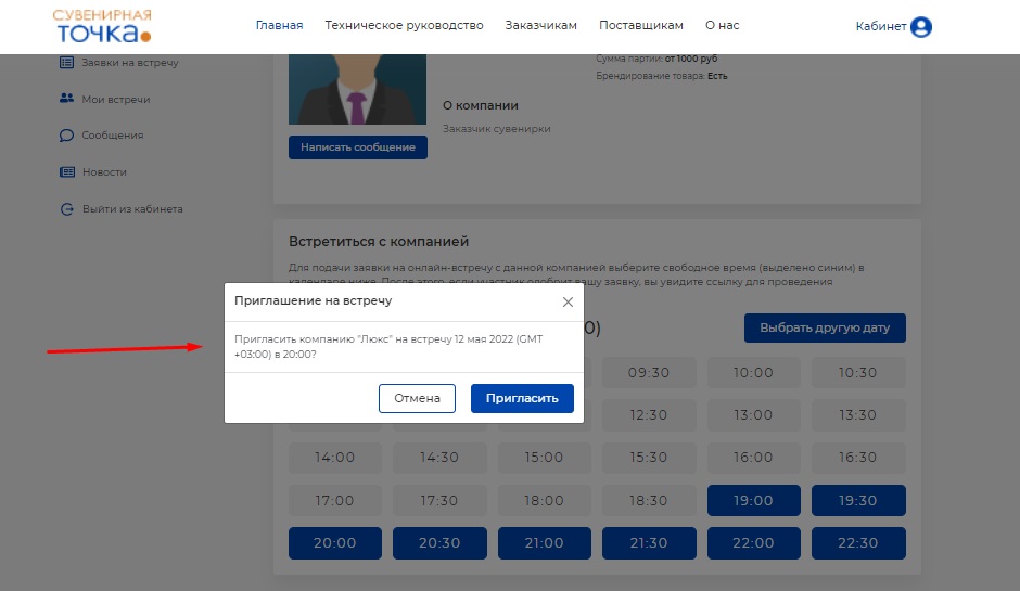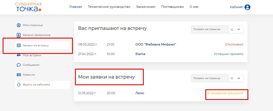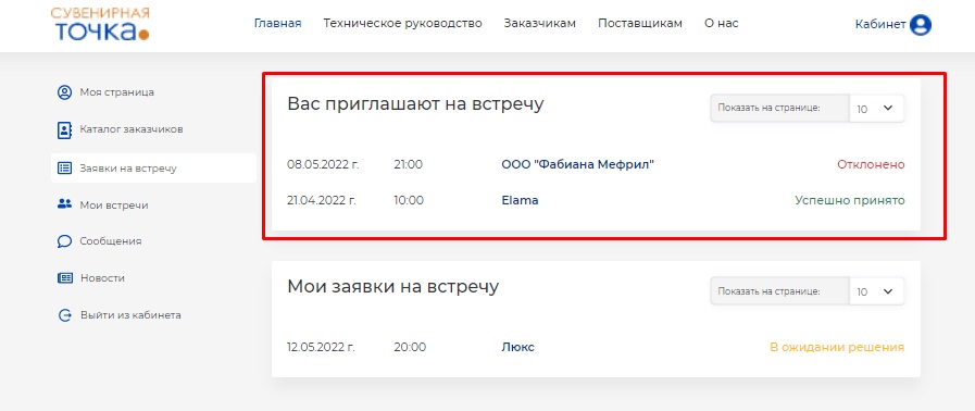 Назначенная вами встреча будет отражена в разделе "Заявки на встречу". Если она будет подтверждена компанией, то станет видна в разделе "Мои встречи".