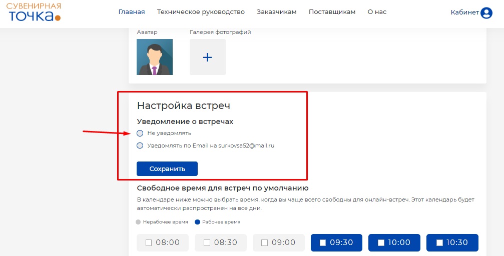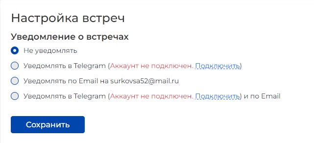 Если вы хотите получать уведомления о встречах и входящих сообщениях на электронную почту или WhatsApp, поставьте галочку в соответствующем окошке "Настройка встреч / "Уведомление о встречах". Существуют следующие виды возможных уведомлений: о том, что вам назначена встреча / о том, что ваша заявка на встречу принята или отклонена / о том, что встреча отменена или перенесена / о том, что ссылка на встречу появилась в ЛК / о том, что встреча состоится через час / о том, что вам пришло сообщение в чат (раздел "Сообщения").