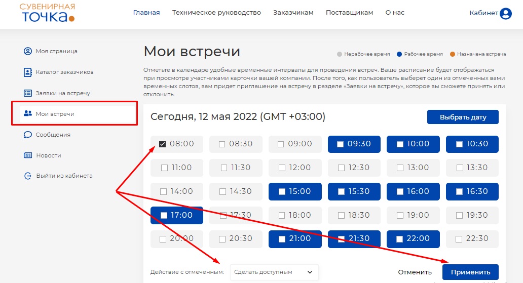 Внизу страницы в разделе "Свободное время для встреч по умолчанию" необходимо обязательно выставить свободные временные интервалы (то время, в которое вы будете доступны для встреч). Для этого проставьте галочки в нужные ячейки и нажмите кнопки "Сделать доступным" и "Применить". Если слоты не проставлены, вы не сможете назначать встречи и принимать приглашения.