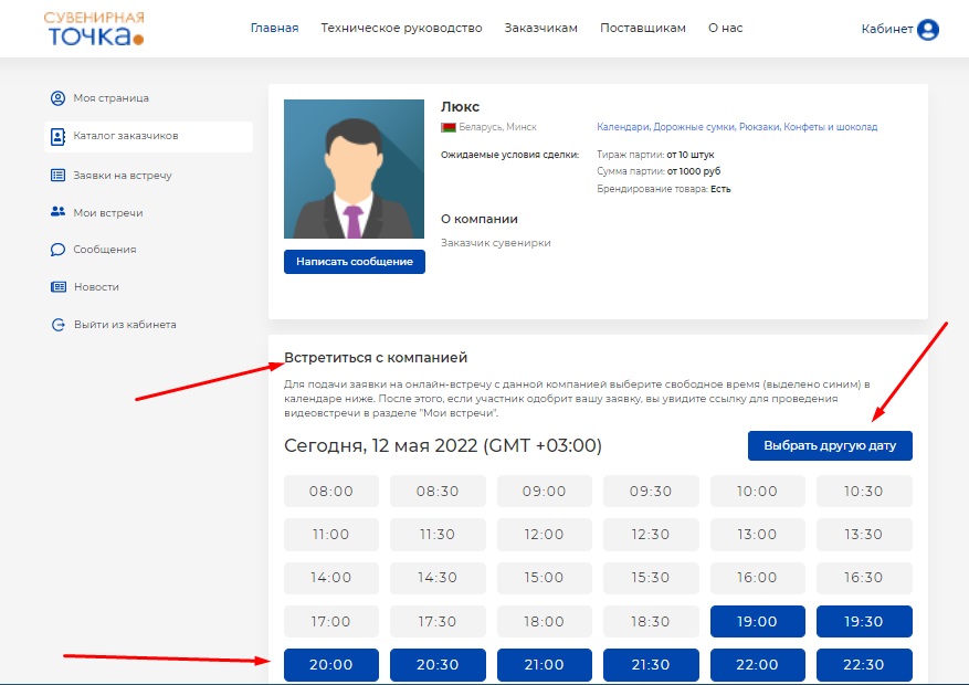 Выбрав интересующую компанию в каталоге, кликнув на ее название, вы переходите на карточку компании, где вы можете назначить встречу в свободные временные интервалы, выделенные синим цветом. Одна встреча длится не более 30 минут. При желании вы можете выбрать два временных слота подряд.