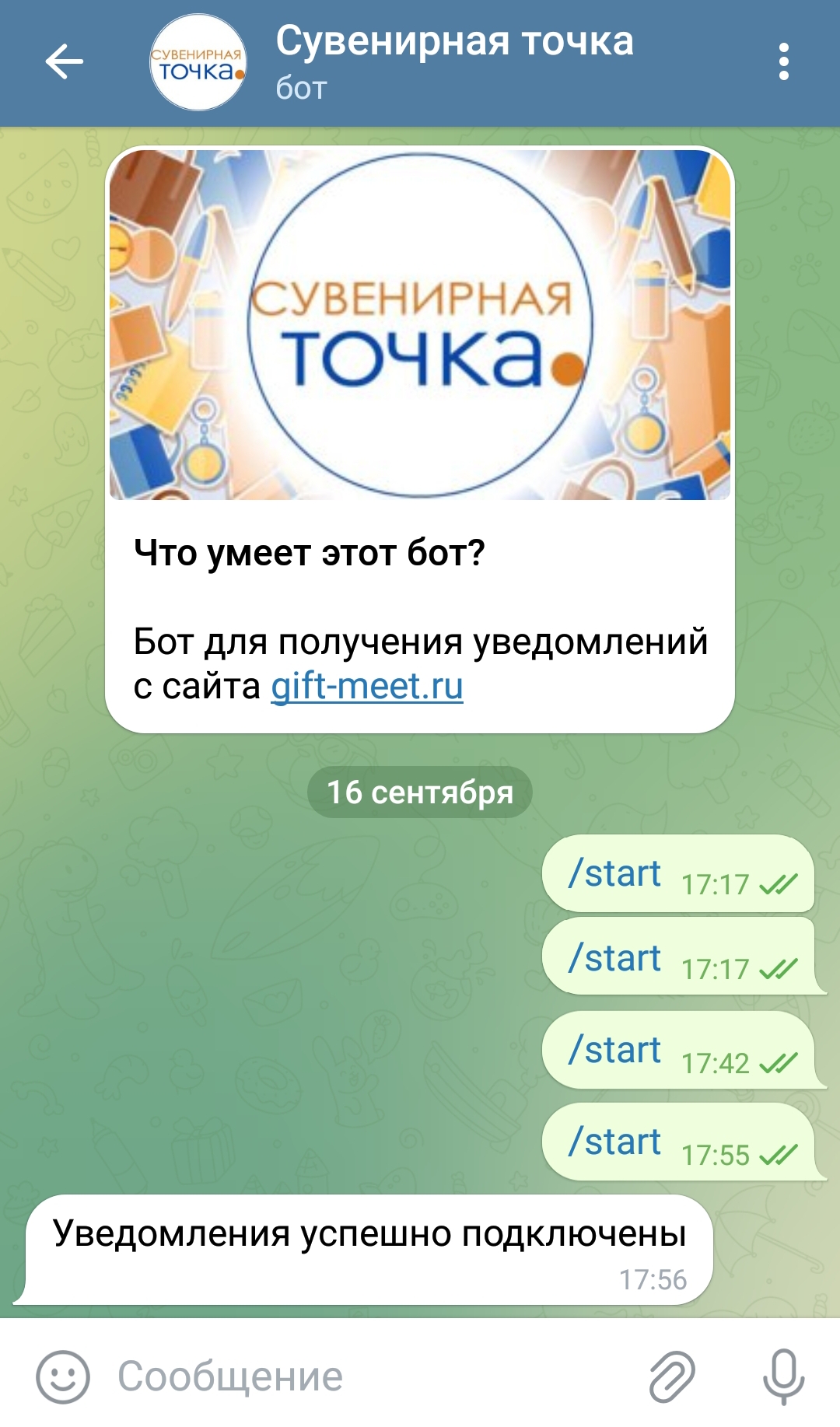 Далее с помощью бота уведомления автоматически подключаются, делать ничего не надо. У вас должна появиться надпись "Уведомления успешно подключены", как на картинке ниже. А в самом личном кабинете в том же разделе уведомлений также будет указано, что уведомления через Telegram подключены. Если вдруг этого не случилось, обязательно сообщите нам об этом.